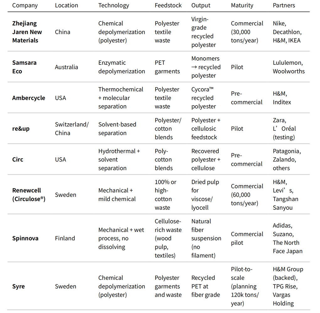 - Polyester-focused solutions (e.g., Jaren, Samsara, Ambercycle, Syre) target PET-based textiles using chemical or enzymatic methods.